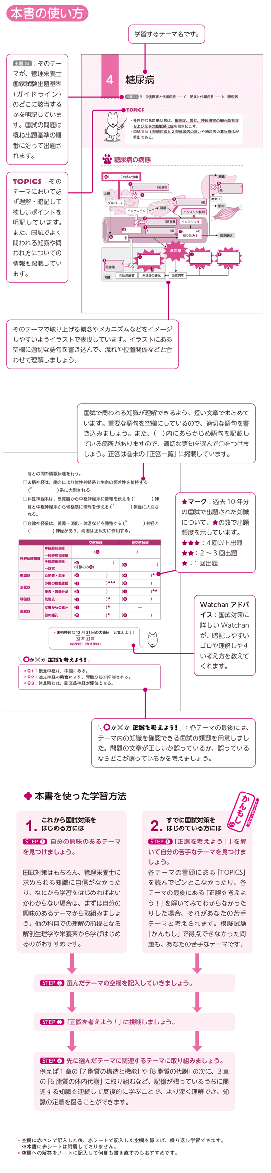 管理栄養士国家試験で出題される10科目のうち、出題の約2割を占めるとともに他の科目との関連が深く国試合格のベースとなる「人体の構造と機能及び疾病の成り立ち」「基礎栄養学」の2科目をピックアップ。国試頻出の知識とその前提知識について、わかりやすいイラストとともに、空欄に重要単語を記入しながら理解を深め、知識の定着を図ります。
